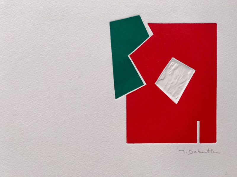 フランスの抽象画家 Jacqueline Debutler(ジャクリーヌ・デビュトレール) による版画作品《Vite !(早く!)》は、戦後フランス抽象芸術の流れに位置する幾何学的抽象の感覚を示す作品です。
