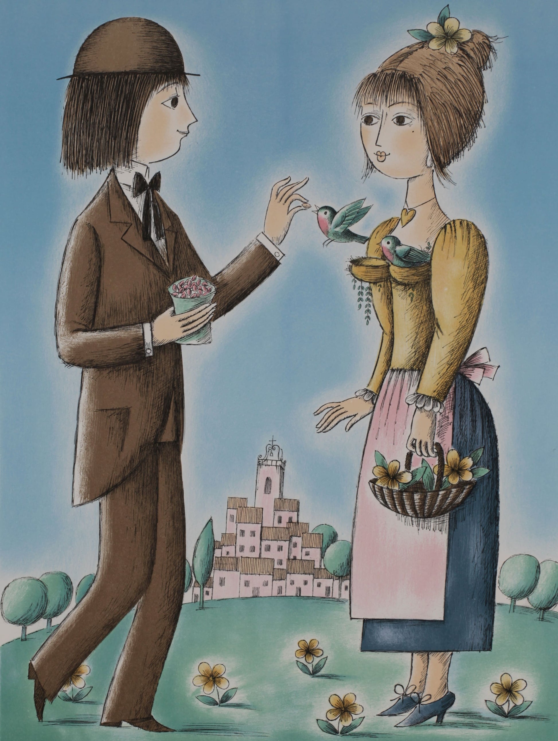 A man is feeding a little bird that has taken up residence on his lover's chest. The lover seems to be a simple and humble woman. The basket she is holding contains flowers blooming on the ground. She must have come to pick them. The colors used are similar, such as the clear blue sky, green (a shade between blue and yellow), and pink (a shade between blue and red), creating a stable and calm harmony of colors. The light brown clothes give a sense of calm. A castle-like building is depicted in the distance, but it is not a castle; it is a collection of small houses. It is inhabited by ordinary people. Does the little bird that has taken up residence on her chest want to fly away with her to a more glittering world? Yes, it seems to be pecking with pleasure at the offerings of the man who does not seem to be very wealthy. Although it is humble, the gentle-looking man adds love to the calm nature and peaceful daily life. You can feel Peynet's loving gaze. There are things more important than money and honor.
