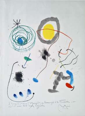 バルセロナ出身のエコール・ド・パリの代表的な画家。当社パリでシュールレアリスム運動に参加してシュールレアリスムの影響が濃厚であったが、その細長く続くことでなく独自のオブジェ形体を創造して、音楽で楽しいミロ独自の抽象画の世界を形成する。 絵画版画でも陶器や彫刻、野外彫刻壁画などにも活動を広げ、世界中で成功を収めた。