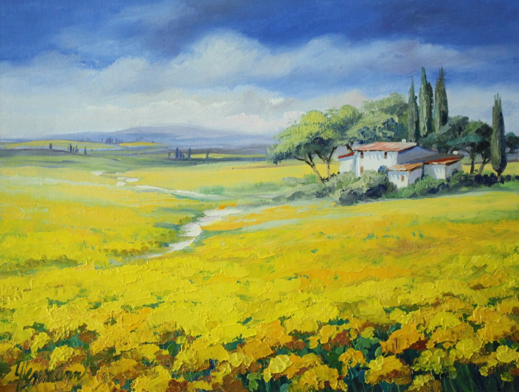 乌特·埃尔曼《穿过油菜花田的小路》油画 30 x 40 cm