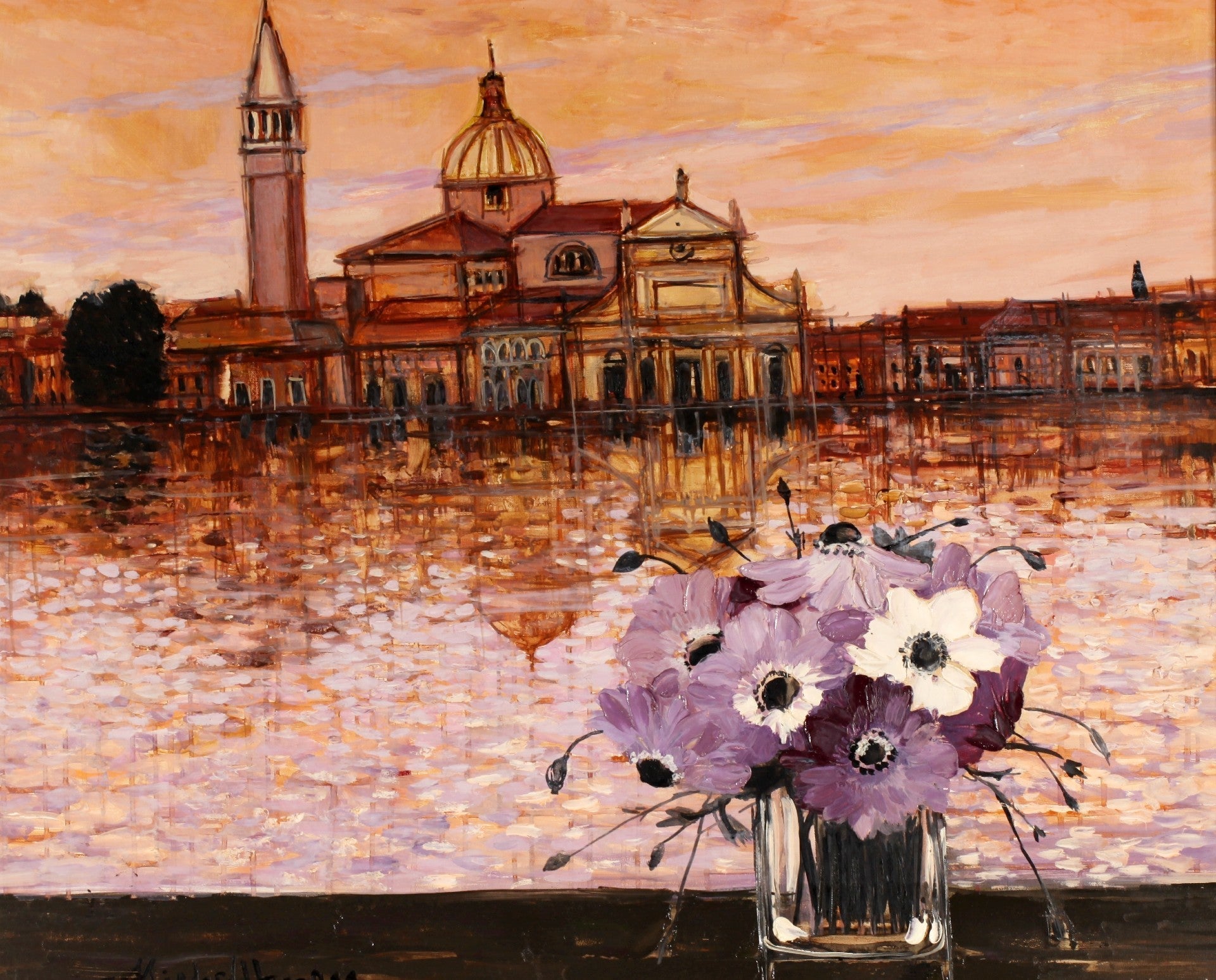 米歇尔·亨利 (Michel Henry) 是一位以绚丽色彩作画而闻名的画家,但他的绘画、构图和纹理之美也同样出色。该建筑的清晰轮廓是米歇尔·亨利 (Michel Henry) 和伯纳德·布菲 (Bernard Buffet) 从纳博讷美术学院的教授那里继承下来的。两个三角形——一个是以圆顶为顶点、高耸入云的尖顶为横边的等腰三角形,另一个是以威尼斯海滨和连接尖顶与圆顶的线为界的三角形——与前景中紫色玫瑰的(圆形)球体形成对比,使这幅画呈现出一种几何美感。