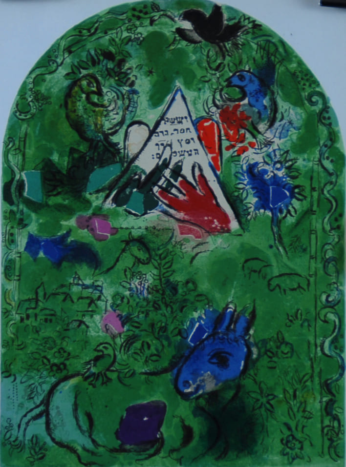 除了绘画和版画外,夏加尔还为教堂制作壁画和彩色玻璃窗。 1959年,夏加尔创作了12扇彩色玻璃窗来装饰耶路撒冷的犹太教堂,为了纪念此事,他于1962年出版了他的作品集《耶路撒冷之窗》,其中收录了14幅原始石版画。这本艺术书收录了古代犹太教12个部落的故事画作,与教堂的12扇彩色玻璃窗相同,还有另外两幅原创石版画。这幅作品是艺术书籍《耶路撒冷之窗》原版石版画的装裱版本。艺术书籍的最后一页有艺术家的签名,以证明这是艺术家的原创石版画。