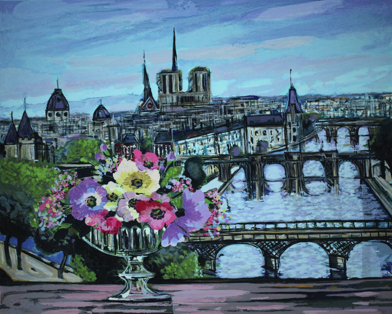 画作背景为巴黎圣母院,这是一座典型的哥特式教堂,始建于12世纪中叶,耗时约一个世纪,前景为塞纳河畔窗边的鲜花蜜饯。整体色调柔和。图案从正面第三座桥的右端开始,穿过桥,穿过白色建筑并连接到果盘的左端,然后沿着果盘的底部延伸到花朵的右端,形成一个螺旋构图。视线首先被吸引到右边的桥,即从正面数第三座桥,它是透视的焦点和螺旋构图的起点。然后,顺着螺旋曲线,到达了那束果盘花束,这是画中唯一的亮色。在色彩天堂里游玩了一会儿,稍事休息后,目光再抬起,看到巴黎圣母院的塔楼,才知道这幅画是为巴黎圣母院而画的。